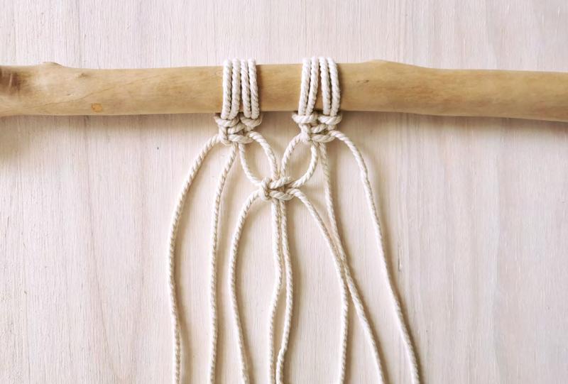 Placez-vous entre les deux nœuds plats et prenez les deux dernières et les deux premières cordes. Avec ces quatre cordes, vous pouvez à présent réaliser un nouveau nœud plat.