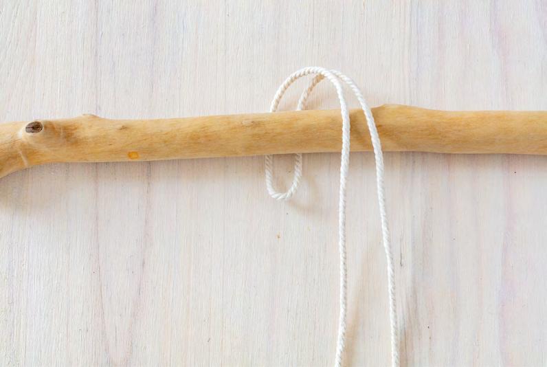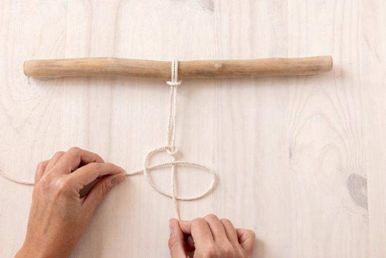 Pliez en deux et en son milieu votre corde. Faites passer la boucle derrière le support d’attache (bois ou fil).