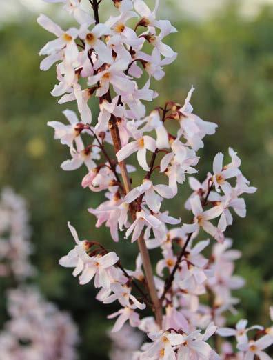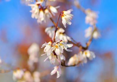 Natif de Corée, cet arbuste aux branches minces, souples et arquées, peut atteindre au jardin 2,50 m de haut. Les feuilles ovales mesurent 8 cm de long, elles sont vert foncé pour devenir pourpres à l’automne, avant de disparaître et de laisser la place, à la fin de l’hiver, aux fleurs odorantes, blanches aux pétales marqués de rose, et disposées en grappe.