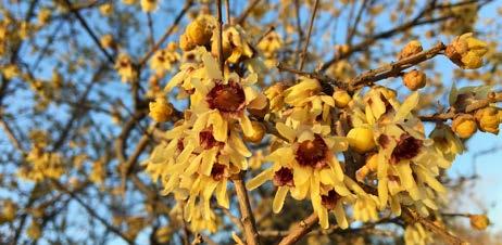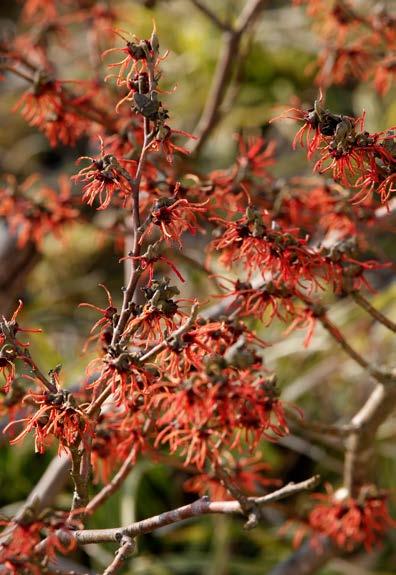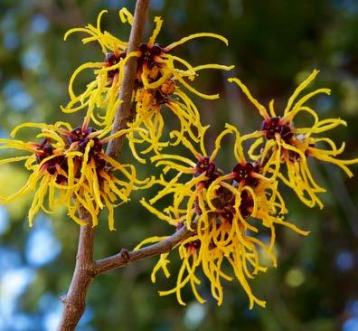 Les hamamélis sont des arbustes au port étalé (jusqu’à 4 m de haut), qui se couvrent en plein hiver, sur des tiges dénudées, de délicates fleurs jaunes aux pétales en lanières se pliant et se dépliant, au gré de la température. Les feuilles qui ressemblent à celles du noisetier apparaissent lorsque les fleurs commencent à faner. à l’automne, le feuillage se pare de belles couleurs : jaune et rouge cuivré.