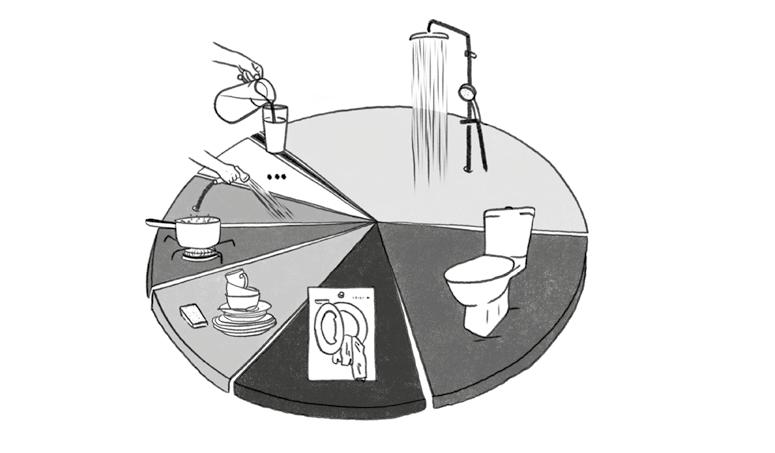 Cette répartition des usages est intéressante à plusieurs titres. La part vitale, la boisson, ne représente qu’un à deux litres par jour (1 %). Avec l’eau de cuisson, une dizaine de litres supplémentaires (6 %), ce sont les seuls besoins nécessitant une eau potable, sachant qu’une ébullition peut, dans la majorité des cas, assurer la potabilisation. Pour les plus gros postes de consommation, 30 litres (20 %) partent à la chasse tous les jours, autant que pour la vaisselle et le lavage du linge réunis. Enfin, c’est la douche et ses 60 litres d’eau quotidiens qui remportent la palme d’eau (39 %).
