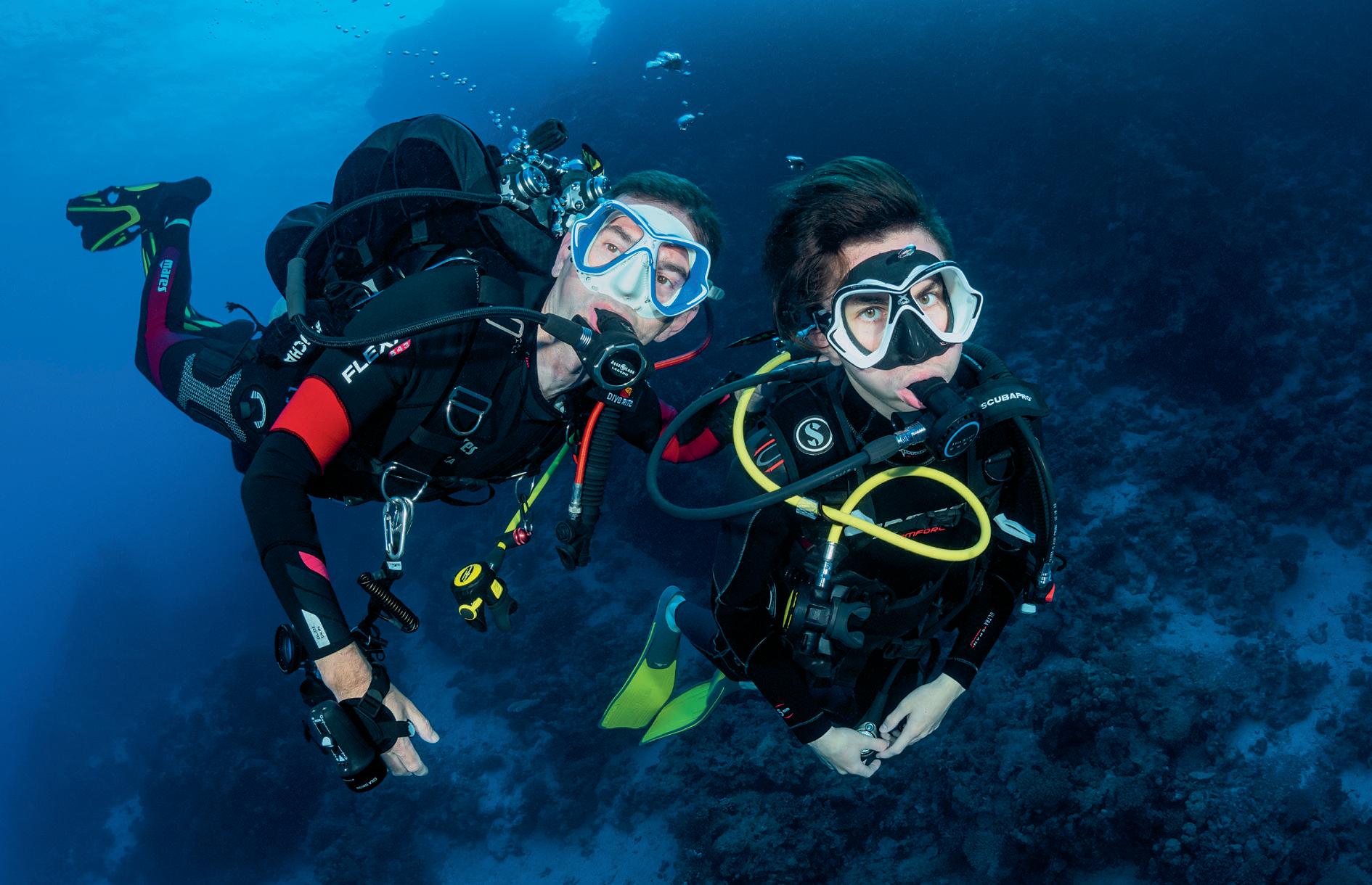 Ce niveau un peu plus exigeant va élargir vos préroga tives en termes d’autonomie et d’accès à la profondeur. Il peut se passer à partir de 16 ans. La partie théo rique est approfondie, notamment les notions de calcul de consommation, les procédures de désaturation, la réglementation. Des compétences sont attendues pour planifier la plongée, l’orientation (avec ou sans instruments de type compas) et porter assistance à un plongeur en difficulté (remontée de 20 mètres à vitesse contrôlée). Le plongeur niveau 2 peut plonger dans l’espace lointain (jusqu’à 40 mètres) ; savoir se stabiliser dans cette zone pour éviter l’essouffle ment est primordial. Le PA 20 (plongeur autonome 20 mètres) peut plonger en autonomie, sans encadrant, jusqu’à 20 mètres, en binôme ou en palanquée d’un niveau équivalent ou supérieur dès 18 ans. Le PE 40 (plongeur encadré) peut évoluer jusqu’à 40 mètres avec encadrement.