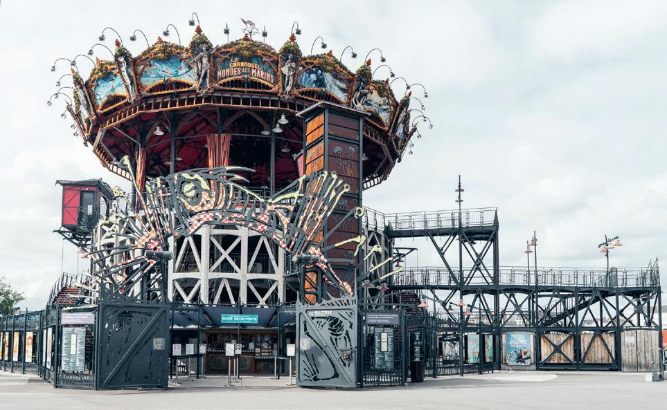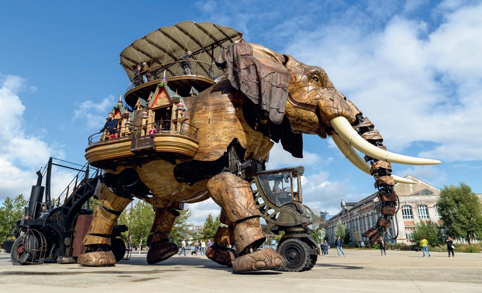 Mais la singularité la plus étonnante de Nantes, c’est la Galerie des Machines de l’Île, un lieu vivant avec la mise en scène d’un véritable bestiaire de machines. Un immense éléphant de bois et de métal, équipé d’un moteur hybride, trottine entre hautes grues et hangars. Son panier de transport peut accueillir 50 touristes. Une nuée de papillons mécaniques peut être activée par un visiteur pédalant sur un vélo. Face au musée Jules Verne, on peut monter sur le Carrousel des Mondes, un aquarium méca nique où d’étranges créatures marines tournent
