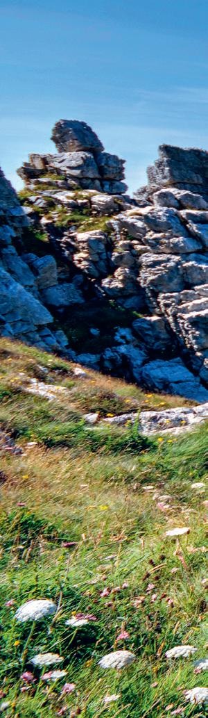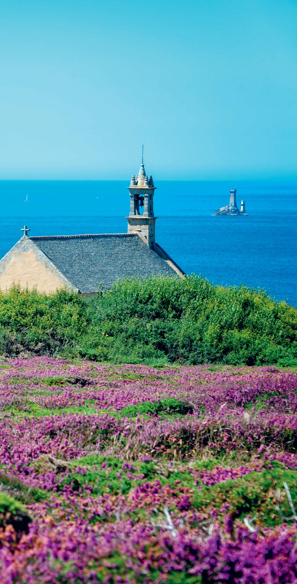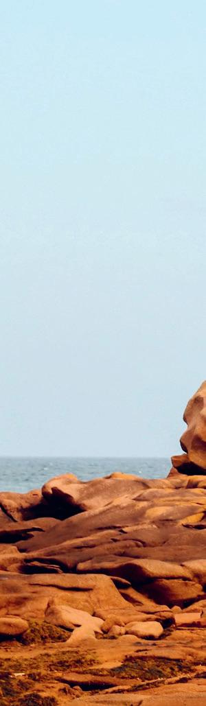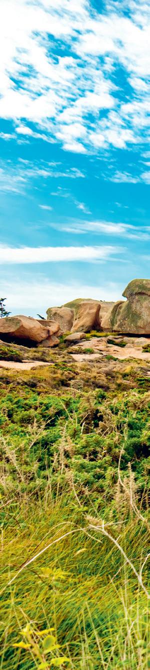 environnants et surtout les couleurs du littoral nous enchantent. L’endroit était aussi très connu pour l’extraction du granit jusqu’au début du xxe siècle et le paysage en est marqué. Le tour de l’île, sur 7 km, nous fournit un bel échauffement pour cette nouvelle journée. De retour sur le continent, le GR®34 nous entraîne pour une fois un peu à l’intérieur des terres. Ce petit tour champêtre ne manque cependant pas d’attrait : menhirs, chapelles, fontaines, terrain de golf aussi, rythment notre marche. Nous retrouvons la côte juste après le village de Kérénoc, où nous admirons encore un chapelet d’îlots tout proche, sur une côte rocheuse, où les