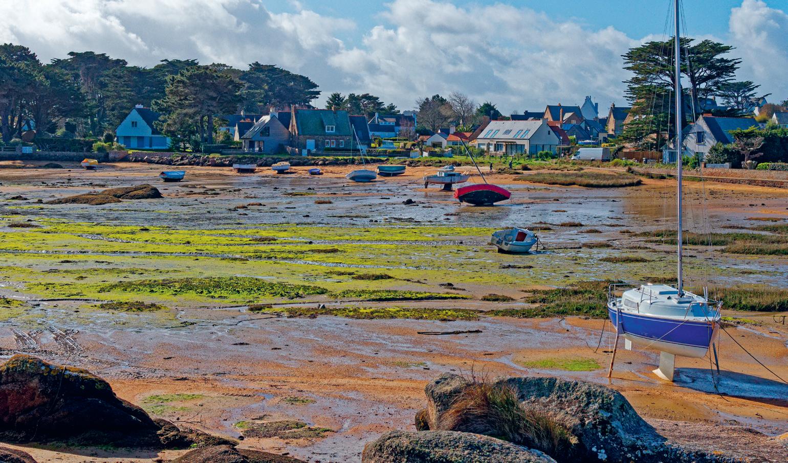 Pour l’heure, les rues pittoresques de Lannion, la capitale du Trégor, accueillent nos premiers pas. Les escaliers de Brélévenez 1 (voir p. 80) et l’église du xiie siècle nous plongent directement dans l’ambiance, puis les charmantes maisons du centre à pans de bois nous charment encore davantage. Cette belle impression nous accompagne jusqu’à la sortie de la ville, que nous atteignons en suivant les rives du Léguer, un petit fleuve côtier d’à peine 60 km de long, qui creuse ici une belle vallée verdoyante. Nous marchons sur des rives dominées par des coteaux bien abrupts, jusqu’à parvenir à la baie de la Vierge et rejoindre celle de Lannion. La vue sur la mer s’ouvre devant nous, alors que nous parvenons à la pointe Servel. La petite plage de Mez an Aod nous offre une petite pause agréable.