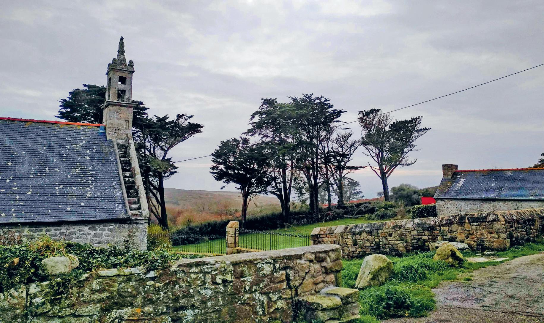 À la pointe, le panorama est magique : une côte découpée, des rochers qui affleurent, le ballet des oiseaux de mer, des vagues et des nuages. Devant nous, le phare de la Vieille 1 , battu par les flots, se dresse telle une sentinelle, gardien de la terre ferme. La visibilité ne nous permet toutefois pas d’apercevoir l’île de Sein. Poursuivons notre tour des pointes en descendant vers le petit port naturel de Bestrée. Quelques bateaux s’y balancent, sur une mer agitée. Un panneau rappelle d’ailleurs l’accident du petit bateau touristique qui reliait l’île de Sein à Bestrée, dans les années 1970. Pas engageant. Néanmoins, l’endroit est calme et apaisant. Nous remontons ensuite vers les petits hameaux disséminés autour du village de Plogoff 2 .