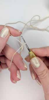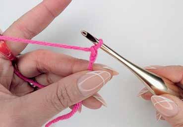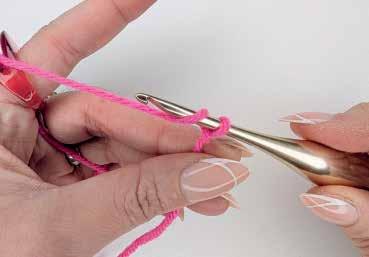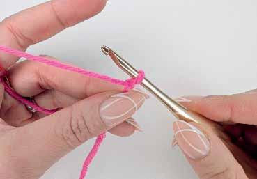 Beaucoup de projets commencent par une chaînette dans laquelle vous réalisez le rang de base de votre ouvrage. Commencez par un nœud coulant. Faites une boucle à quelques centimètres de l’extrémité du fil, insérez le crochet dans la boucle et faites un jeté. Pour cela, passez le fil de travail sur le crochet de l’arrière vers l’avant. Ramenez le fil à travers la boucle sur le crochet (Fig. 5).