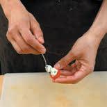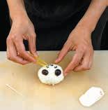 Avec une paille fine, découpez 8 cercles dans la mozzarella. Placez-les sur les yeux de nori. Coupez chaque olive en deux en guise d’oreilles.