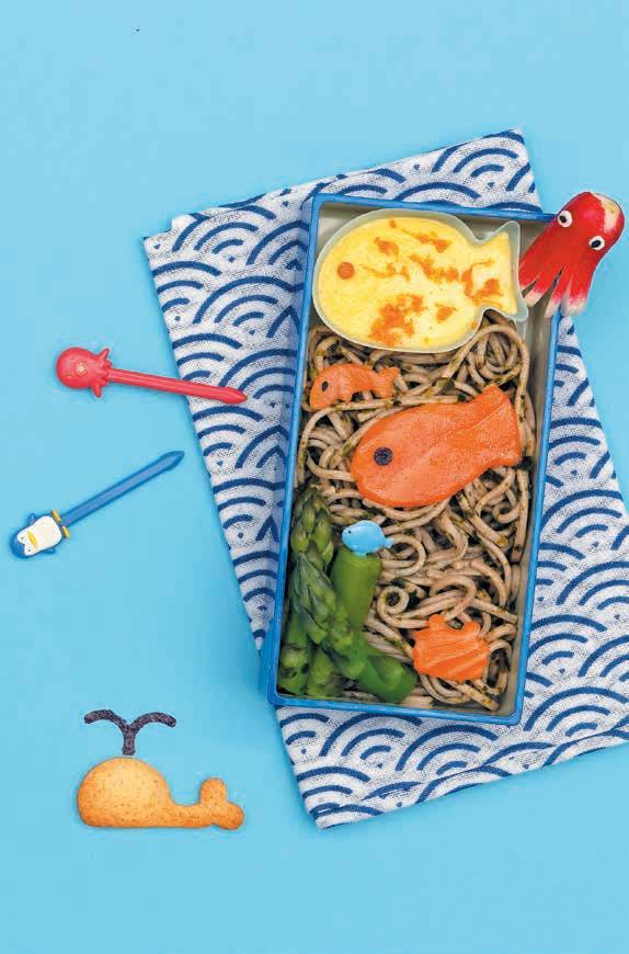 Garnissez les bento de nouilles soba et déposez dessus les petits poissons de saumon fumé.