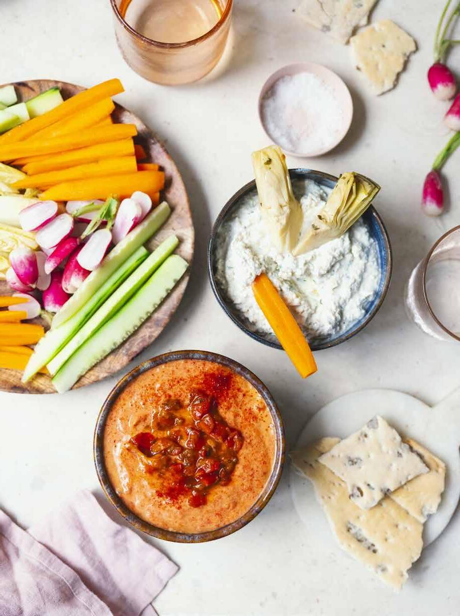Disposez tous les légumes dans un plat de service et sortez les dips bien frais au moment de l’apéritif !