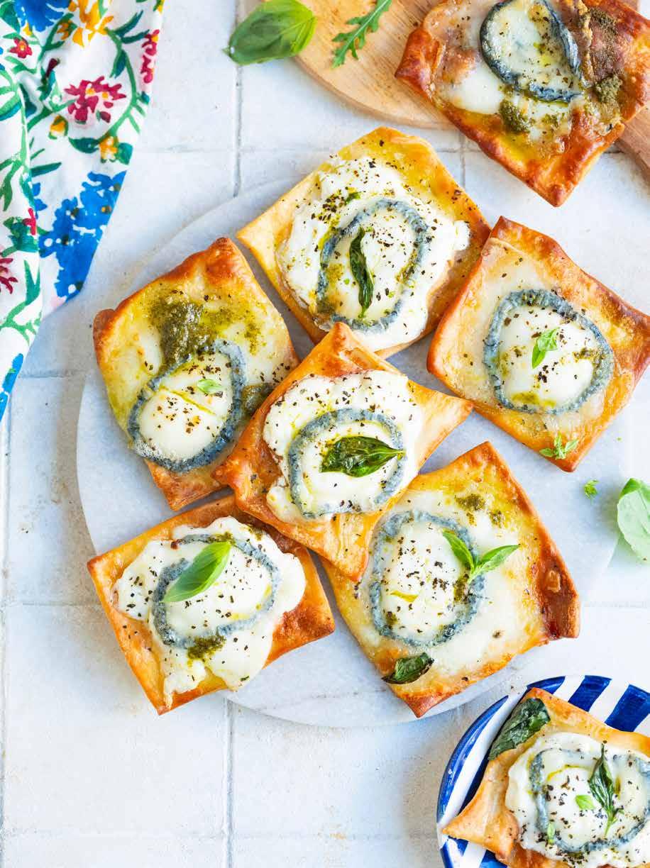 Lorsque les pizzettes sont bien fondantes, sortez-les du four et disposez une feuille de basilic frais sur chaque pizzette avant de les servir. Dégustez-les bien chaudes.