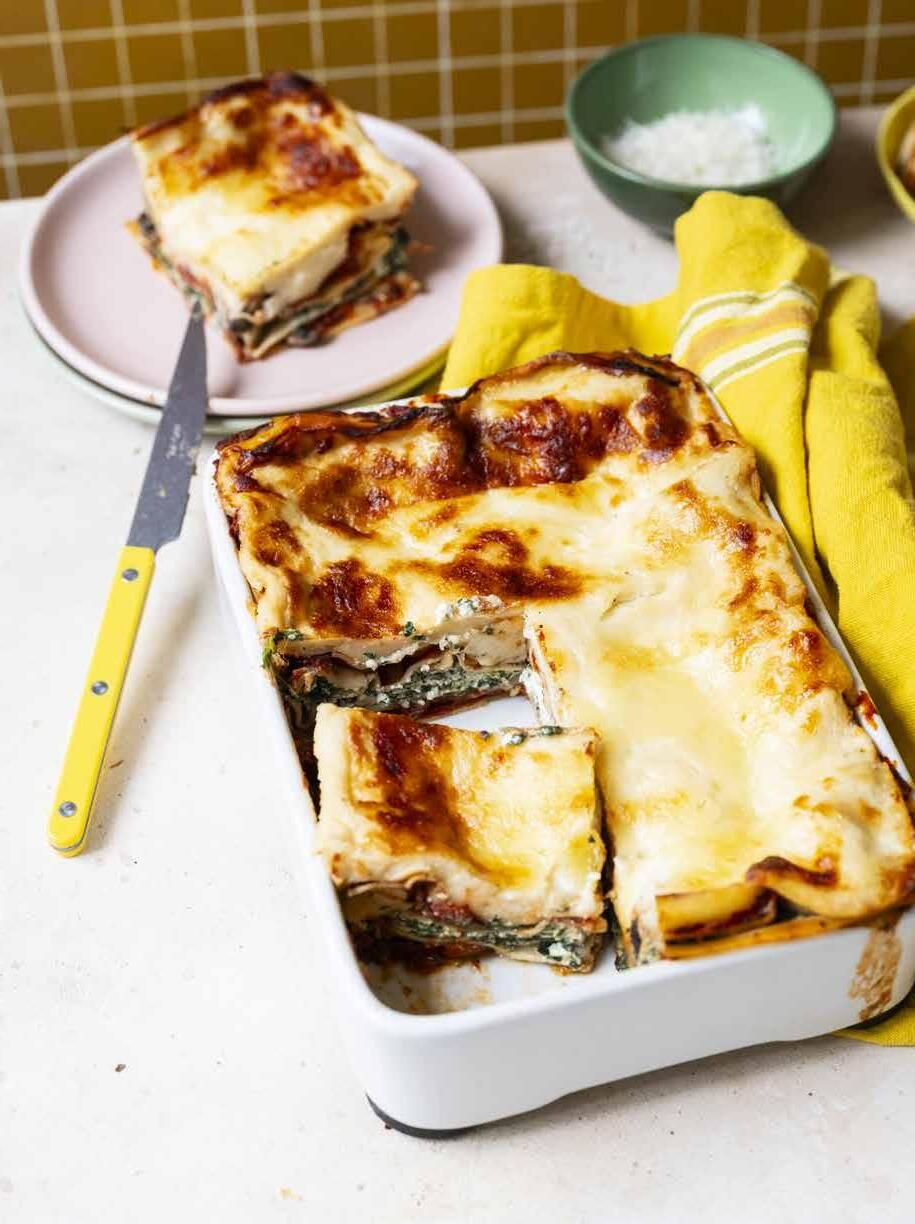 Dans un plat à gratin, versez l’huile d’olive et ajoutez une couche de feuilles de lasagne, puis de la sauce tomate. Recouvrez de feuilles de lasagne, puis ajoutez des épinards et une nouvelle couche de feuilles de lasagne. Versez le reste de sauce tomate, terminez par la béchamel et parsemez de mozzarella.