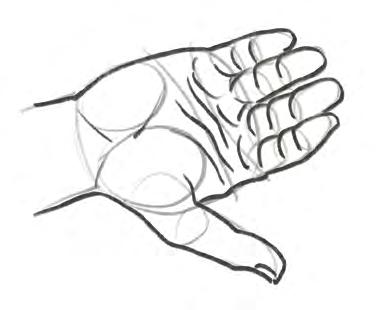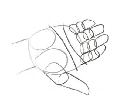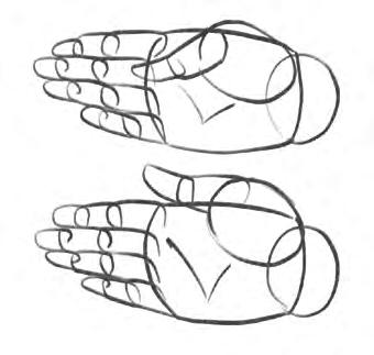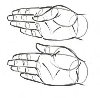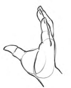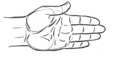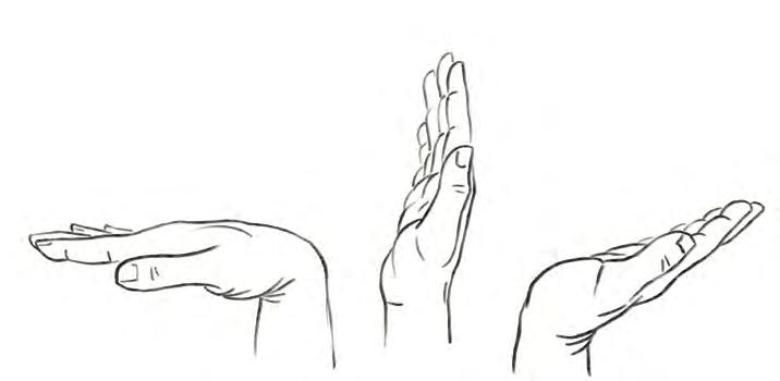 De profil, la main paraît plate : les doigts se cachent les uns derrière les autres. Si le pouce s’avance, il crée un volume important dans la paume.