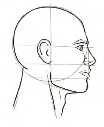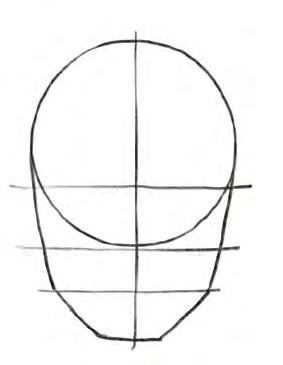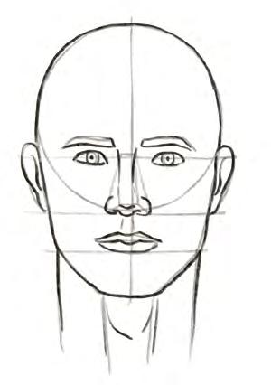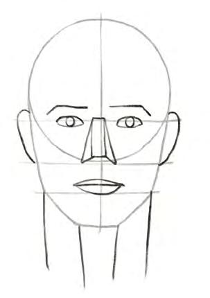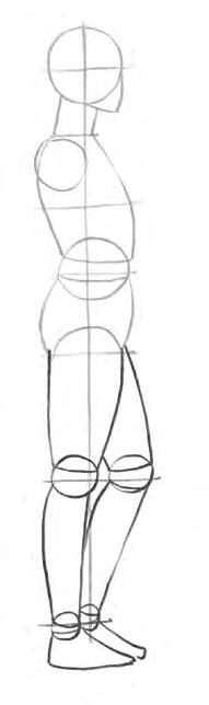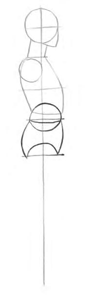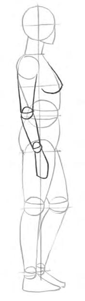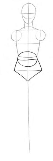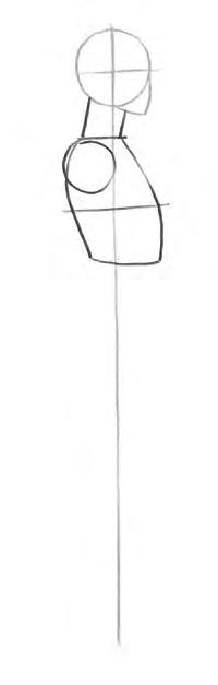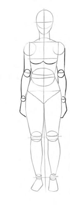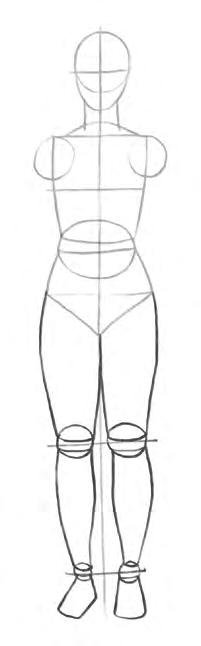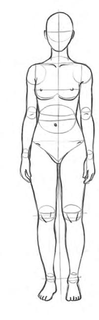 De face, commencez par tracer la forme de la tête sur une ligne verticale, en veillant à comparer chaque nouveau volume à ceux déjà dessinés. Descendez ensuite pour ajouter les épaules, généralement plus étroites que les hanches. Donnez aux membres un peu de galbe, mais veillez à ce que les poignets et les chevilles restent fins.