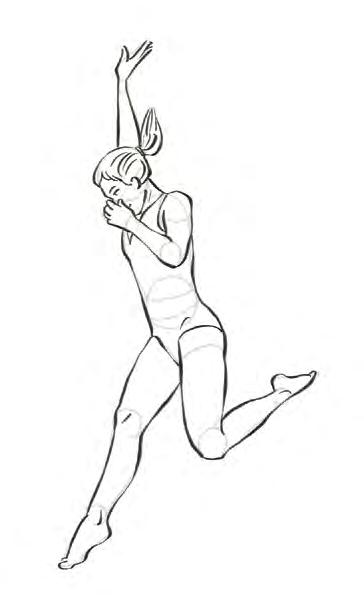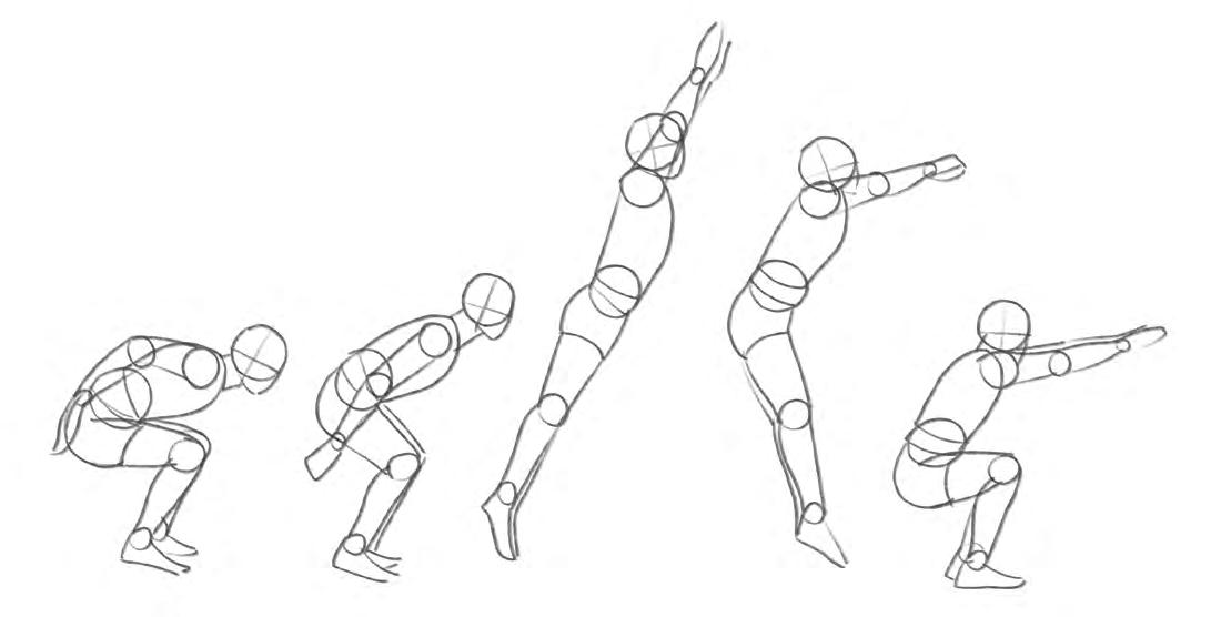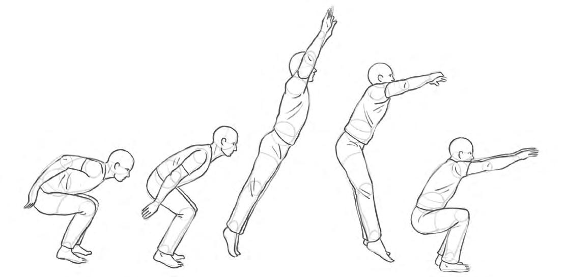 Dans cette série d’étapes, les bras indiquent le mouvement : ils partent vers l’arrière pour prendre de l’élan, puis se projettent vers le haut pour la direction et vers l’avant pour l’équilibre. Les jambes, d’abord stables et pliées au départ et à l’arrivée, s’étirent avec les pieds pointés au milieu du saut.