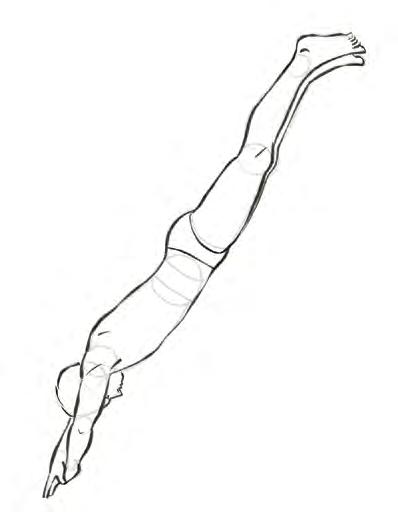Ce personnage suggère qu’il saute vers le bas par son attitude : orientation du regard, une jambe qui pointe vers le sol, un bras et une jambe près du corps, l’autre bras levé.