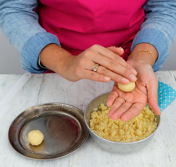 Incorporez ensuite la semoule humidifiée et mélangez jusqu’à l’obtention d’une pâte. Laissez-la reposer 15 minutes.