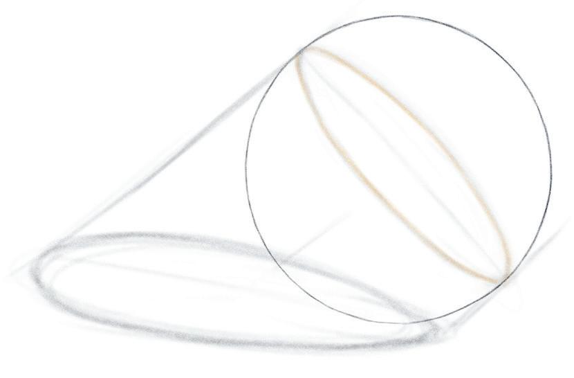 1. Tracez un cercle pour la sphère. Notez l’ombre portée sur le support, puis la frontière où la lumière va basculer dans l’ombre par une ellipse (en orange). Lorsque vous dessinez, repérez-la le plus vite possible.