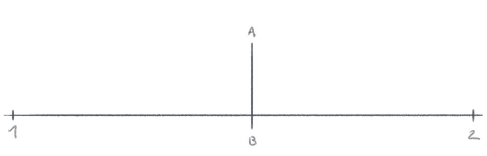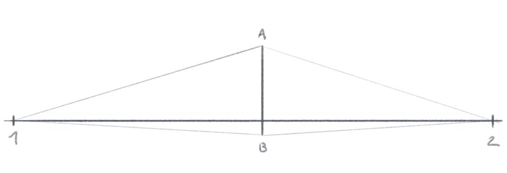 1. Tracez la ligne d’horizon et placez deux points de fuite (1 et 2) à gauche et à droite de la ligne. Puis représentez un segment vertical AB.