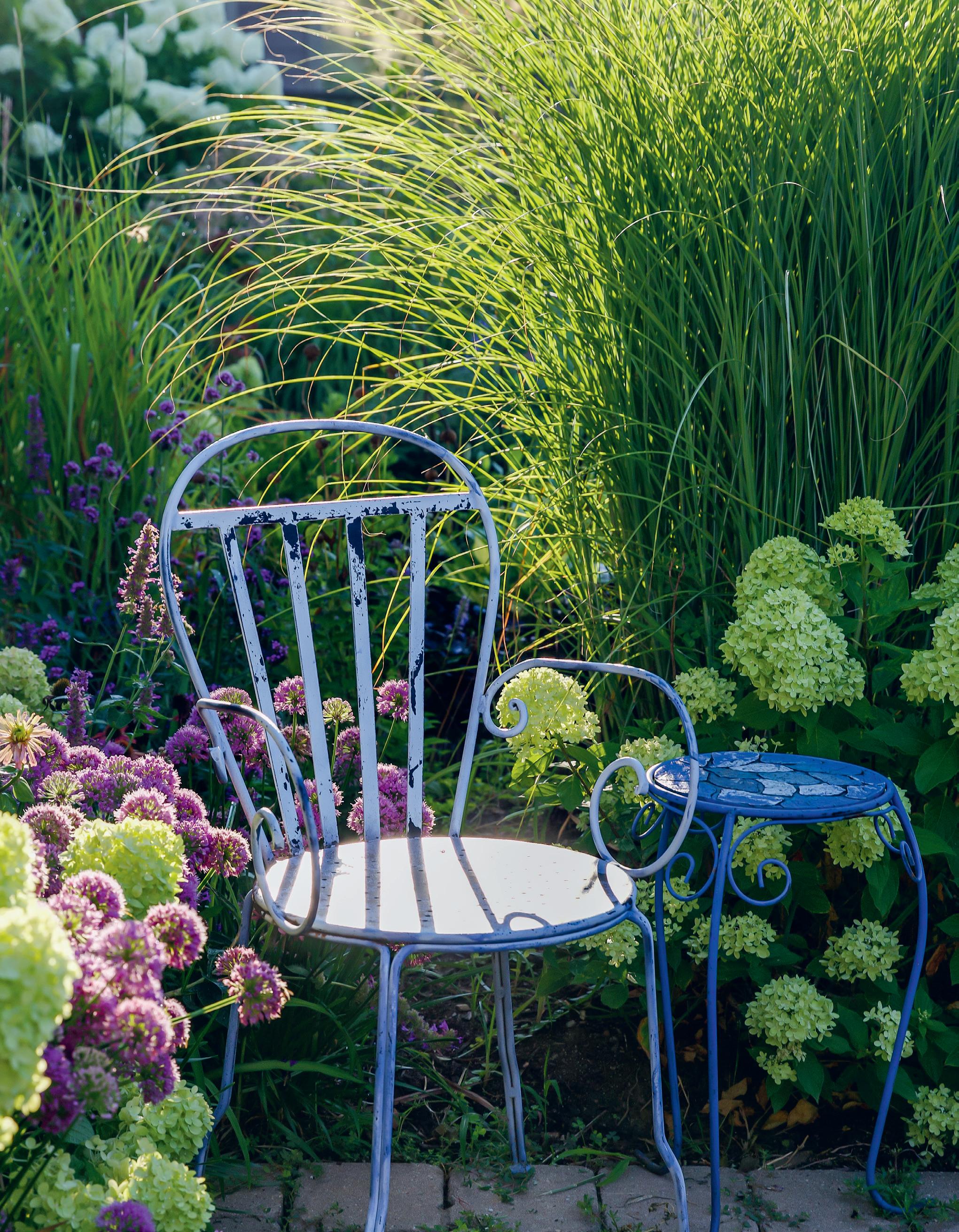 Fig. 2. Une chaise en fer forgé, placée dans un coin de la terrasse, prolonge l’intérieur de la maison vers le jardin. Entourée de fleurs et de verdure, elle invite à savourer son café le matin en robe de chambre et pantoufles.