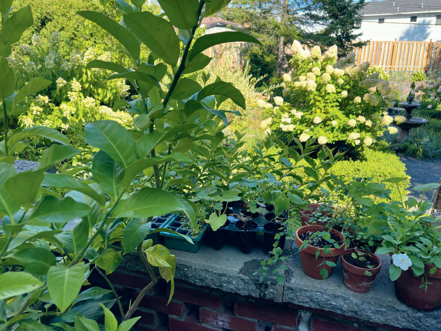 3. Le jardin cottage est toujours en transformation. Contrairement aux jardins formels, plus symétriques et statiques, ce style évolue sans cesse et vit au rythme du jardinier. Ici, des contenants de semis attendent d’être plantés, tandis que des pigamons vieillissent dans leurs pots, à l’abri des intempéries.