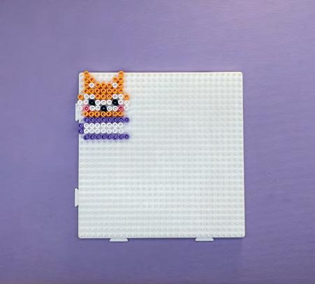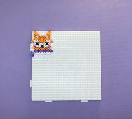 Réalise ensuite le premier livre : commence par poser une première perle violette sous la dernière ligne du renard, à gauche, puis continue avec 7 autres perles (la dernière perle doit dépasser de la dernière ligne du renard d’un picot sur la droite).