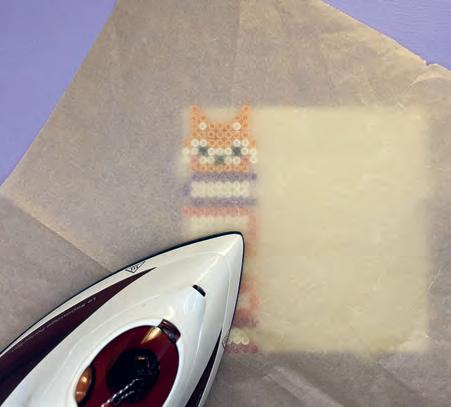 Une fois toutes les perles déposées sur ta plaque, demande à un adulte de la placer sur une planche à repasser ou une surface plane et résistante à la chaleur puis de la recouvrir d’un morceau de papier sulfurisé. Il faut ensuite faire des mouvements circulaires avec le fer à repasser pendant environ 30 secondes (ne pas hésiter à bien observer la pièce au cours du repassage pour en adapter la durée). Le fer doit être à température moyenne à chaude et sans vapeur. Les mouvements circulaires permettent à la chaleur du fer à repasser de se diffuser harmonieusement sur toute la surface du modèle. Sans cela, certaines parties seront plus fondues que d’autres.