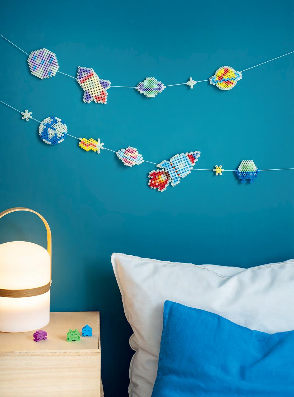 Réalise une belle guirlande sur le thème de l’espace en utilisant des perles phosphorescentes ! Fusées, planètes, étoiles filantes et même petits visiteurs de l’espace, voilà de quoi imaginer de chouettes aventures avant de faire de beaux rêves étoilés.