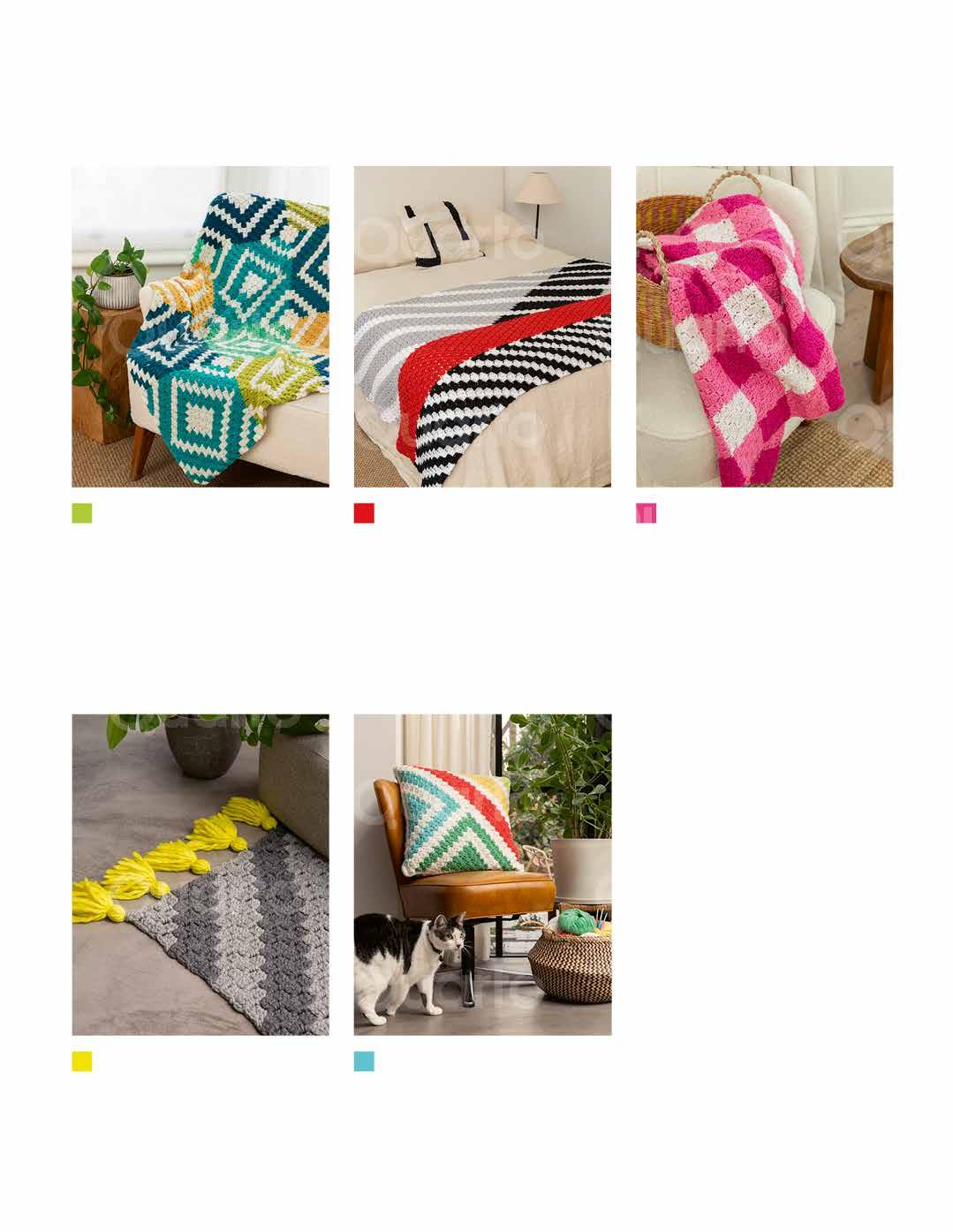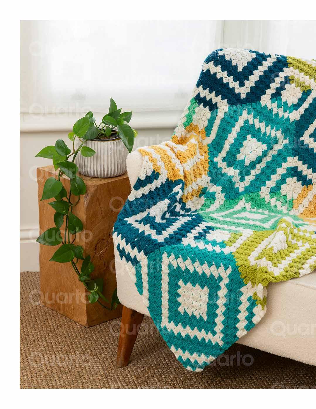 Ce plaid est composé de carrés assemblés au fur et à mesure. Chaque carré présente un losange en son centre, et les angles forment d’autres losanges une fois les motifs associés. C’est un beau projet à réaliser carré par carré. Vous pouvez aussi utiliser le modèle du carré pour confectionner une housse de coussin. Il est également possible de réaliser une grande couverture : appuyez-vous sur les quantités nécessaires pour un carré pour calculer la quantité de fil supplémentaire dont vous aurez besoin.