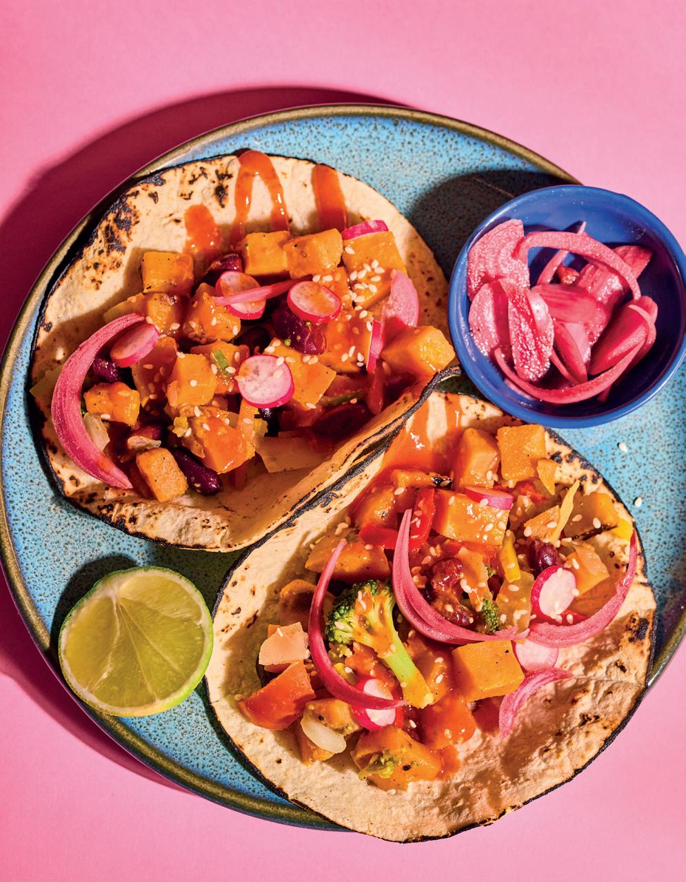 Garnissez chaque tortilla avec les patates douces rôties, les haricots et les garnitures de votre choix.