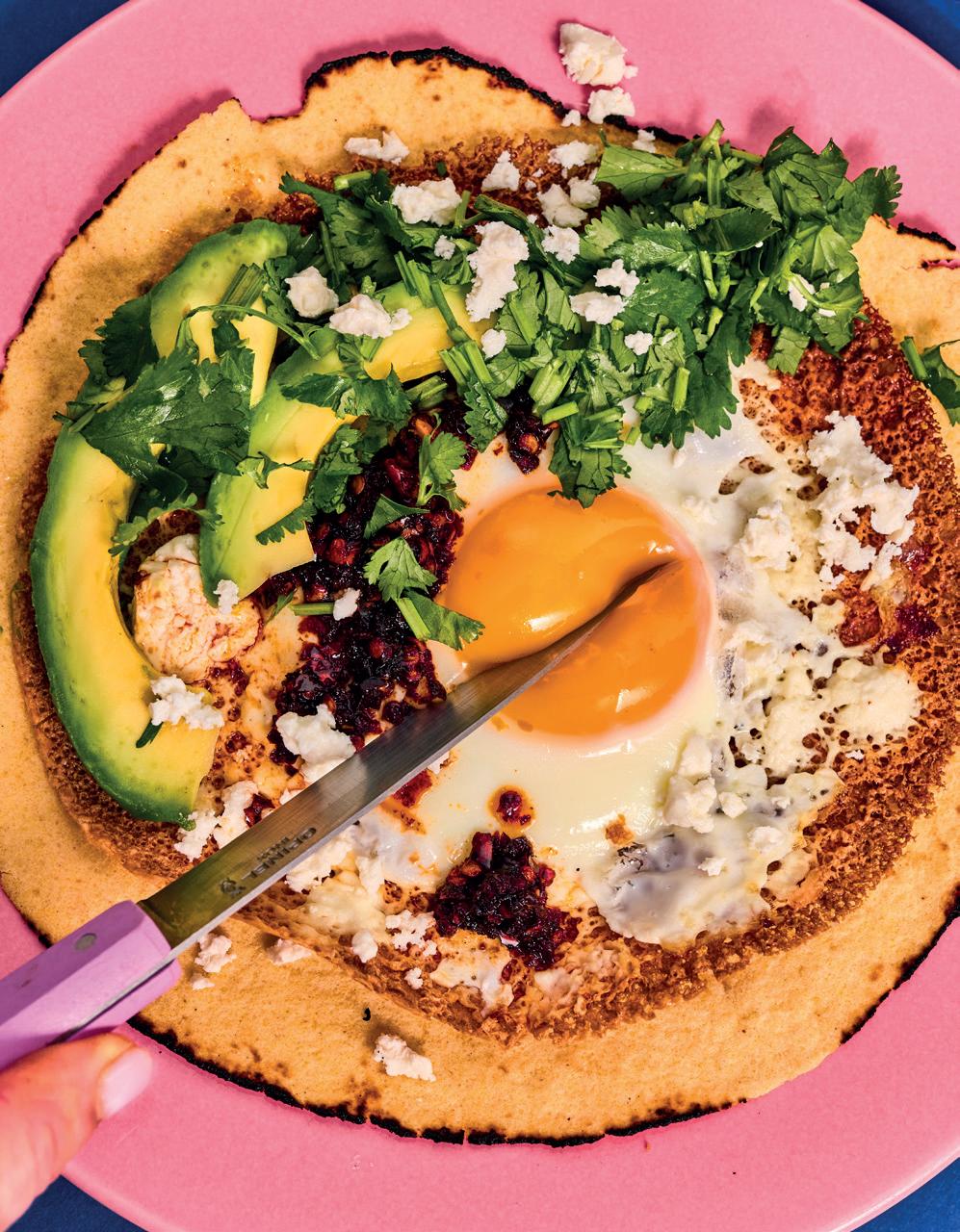 Garnissez chaque tortilla avec l’oeuf à la crispy feta. Garnissez d’avocat et de coriandre. Servez immédiatement.