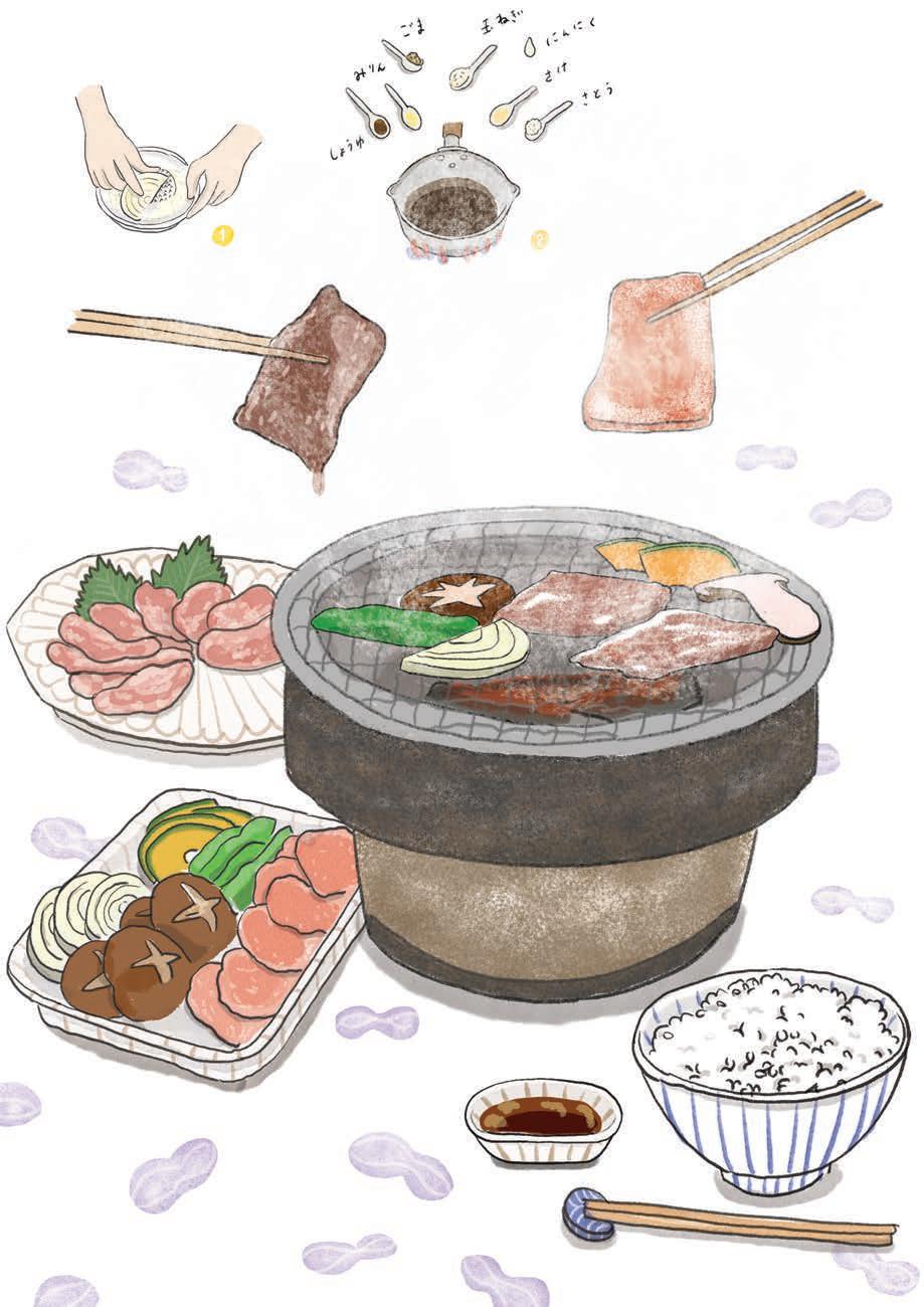 Préparez la sauce yakiniku : déposez l’oignon râpé dans une casserole et portez sur feu vif. Quand l’eau rendue par l’oignon commence à bouillir, ajoutez la sauce soja, le mirin, le saké et le sucre. Faites bouillir 1 minute. Hors du feu, incorporez l’ail râpé et les graines de sésame. Réservez.