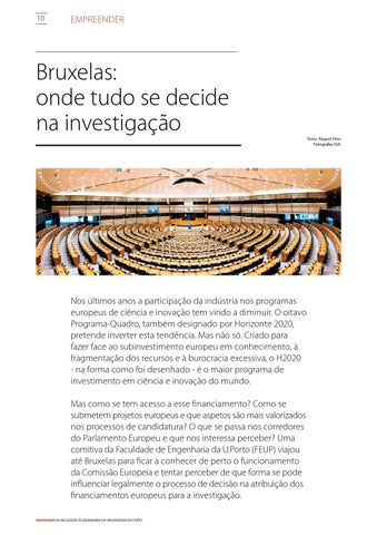 Nos últimos anos a participação da indústria nos programas europeus de ciência e inovação tem vindo a diminuir. O oitavo Programa-Quadro, também designado por Horizonte 2020, pretende inverter esta tendência. Mas não só. Criado para fazer face ao subinvestimento europeu em conhecimento, à fragmentação dos recursos e à burocracia excessiva, o H2020 - na forma como foi desenhado - é o maior programa de investimento em ciência e inovação do mundo. Mas como se tem acesso a esse financiamento? Como se submetem projetos europeus e que aspetos são mais valorizados nos processos de candidatura? O que se passa nos corredores do Parlamento Europeu e que nos interessa perceber? Uma comitiva da Faculdade de Engenharia da U.Porto (FEUP) viajou até Bruxelas para ficar a conhecer de perto o funcionamento da Comissão Europeia e tentar perceber de que forma se pode influenciar legalmente o processo de decisão na atribuição dos financiamentos europeus para a investigação. ENGENHARIA 56 Faculdade de Engenharia da Universidade do Porto