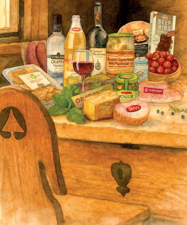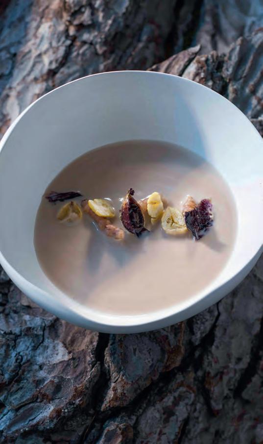 Fertigstellung: Kastaniensuppe in tiefe Teller füllen. Mit getrocknetem Radicchio und in Scheiben geschnittenen Kastanien garnieren. n AnnaMatscher(1961–2025)war Südtirolers erste Sterneköchin. Sie führte gemeinsam mit ihrem Mann und ihrer Tochter das Restaurant „Zum Löwen“ in Tisens.