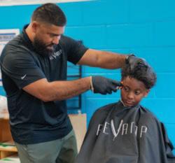 Additional community partners stepped up in a big way: Revamp Barbershop provided professional haircuts.