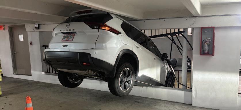 Units from the Broward Sheriff’s Office Department of Fire Rescue, including personnel from the City of Hallandale Beach and the Technical Rescue Team, were dispatched to a report of a vehicle suspended from the second story of a parking garage. Upon arrival, crews confirmed that a vehicle was hanging from the structure. The sole occupant had selfextricated prior to their arrival due to concerns over the vehicle’s unstable position.