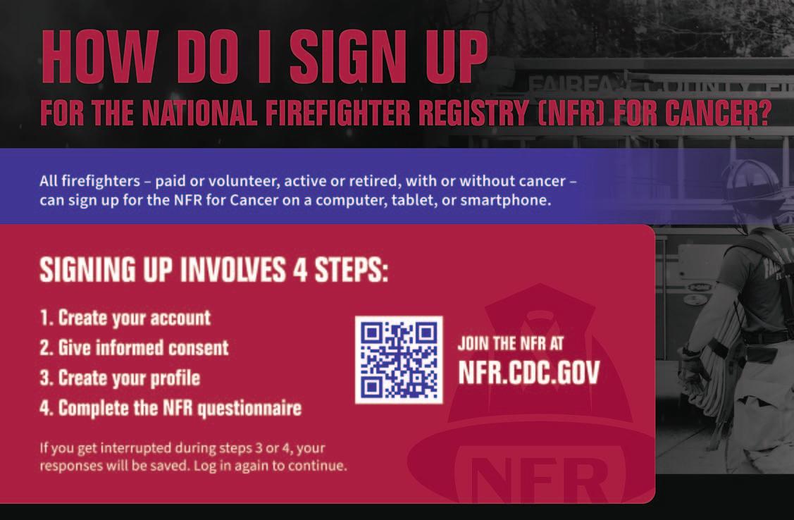 All firefighters—career or volunteer, active or retired, with or without cancer—are encouraged to register. The process takes less than an hour and can be completed from any device by visiting NFR.cdc.gov Every registration helps researchers link occupational exposures to cancer outcomes, shaping