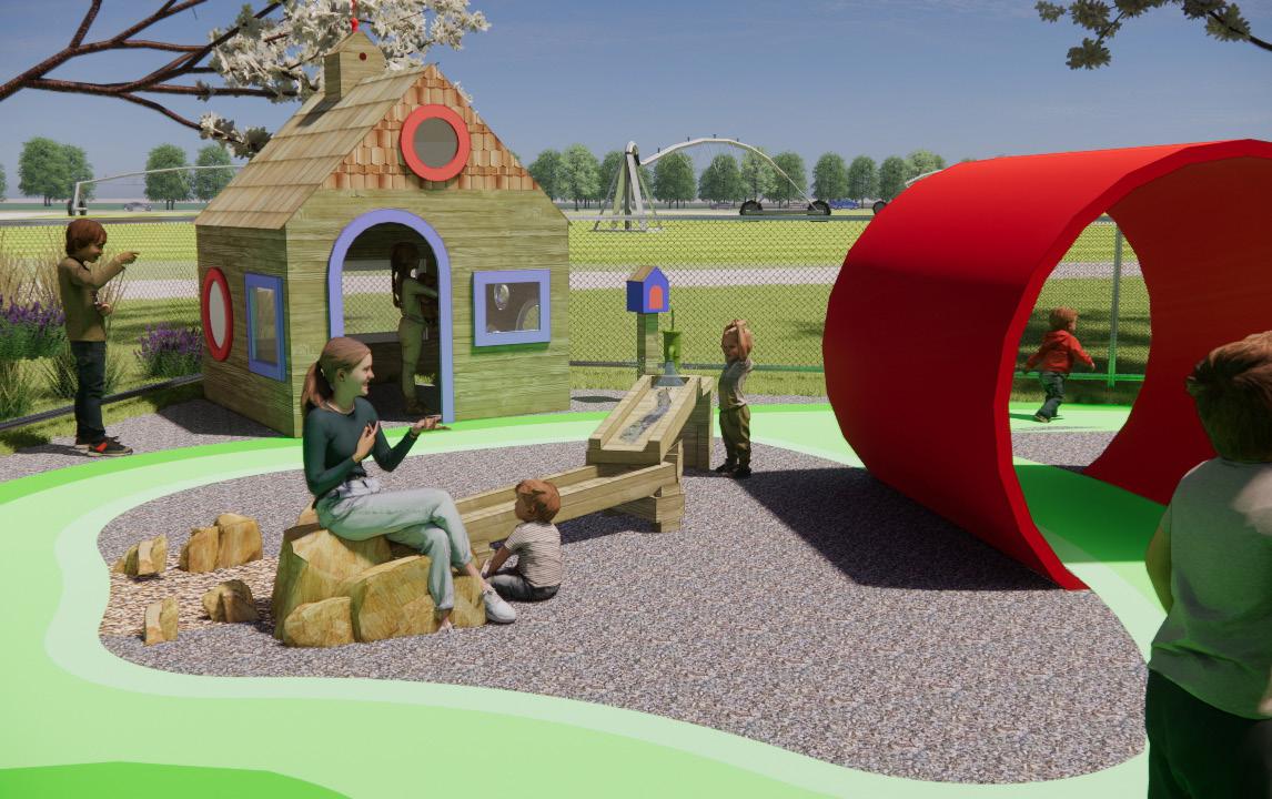 Meet me at the giant fork—you can’t miss it! This giant fork elevates the humble but hard-working utensil into an object of art, and also makes a strong statement to set the scene for the eating-themed play that happens below.