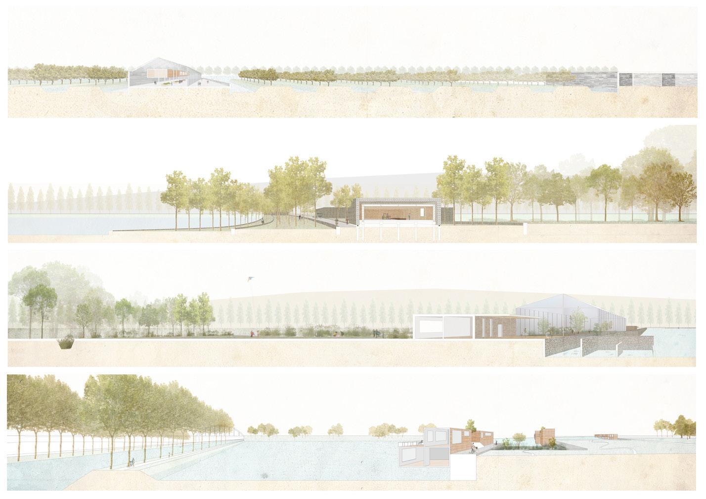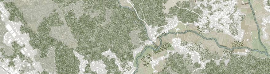 Une autre partie des travaux s’est attachée à comprendre les liens entre aménagement du territoire et capacité de résilience aux bouleversements climatiques (avec le travail de Loïc Dufermont sur l’aménagement des abords fluviaux, à la croisée entre hydrographie et urbanisme), allant jusqu’à envisager la possibilité d’un effondre ment du système industriel actuel et proposer une renaissance à travers des paysages alternatifs, résilients et des initiatives de tran sition (avec le travail de Pierre Lacroix).