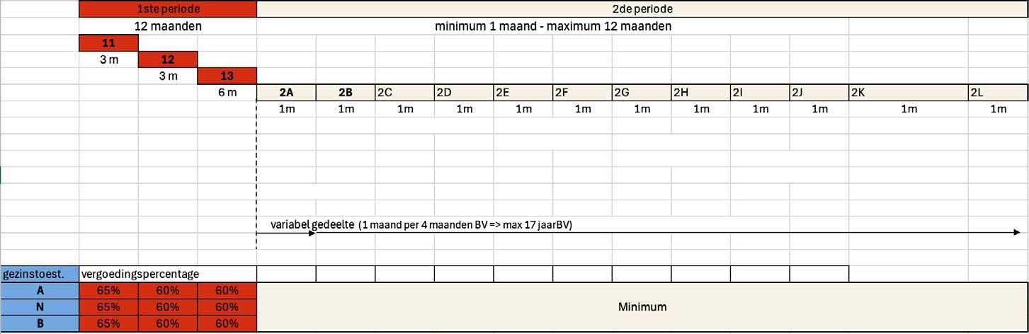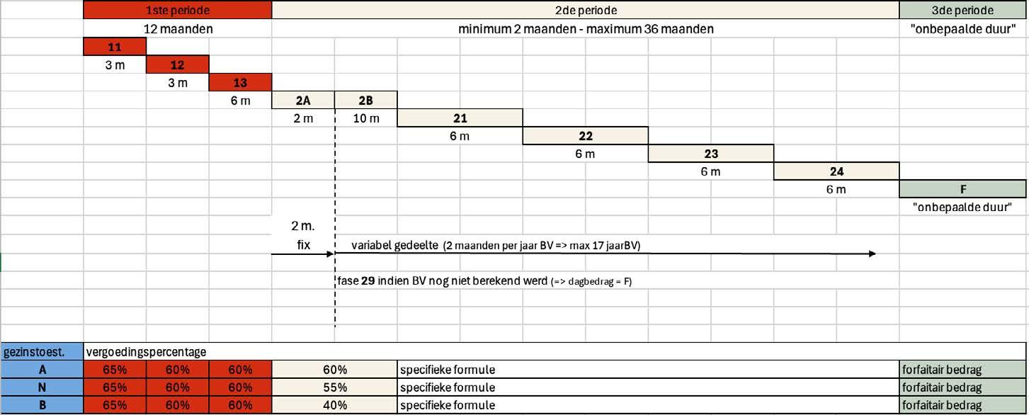 • De eerste periode is vast en duurt twaalf maanden (één jaar); het uitkeringsbedrag is degressief;