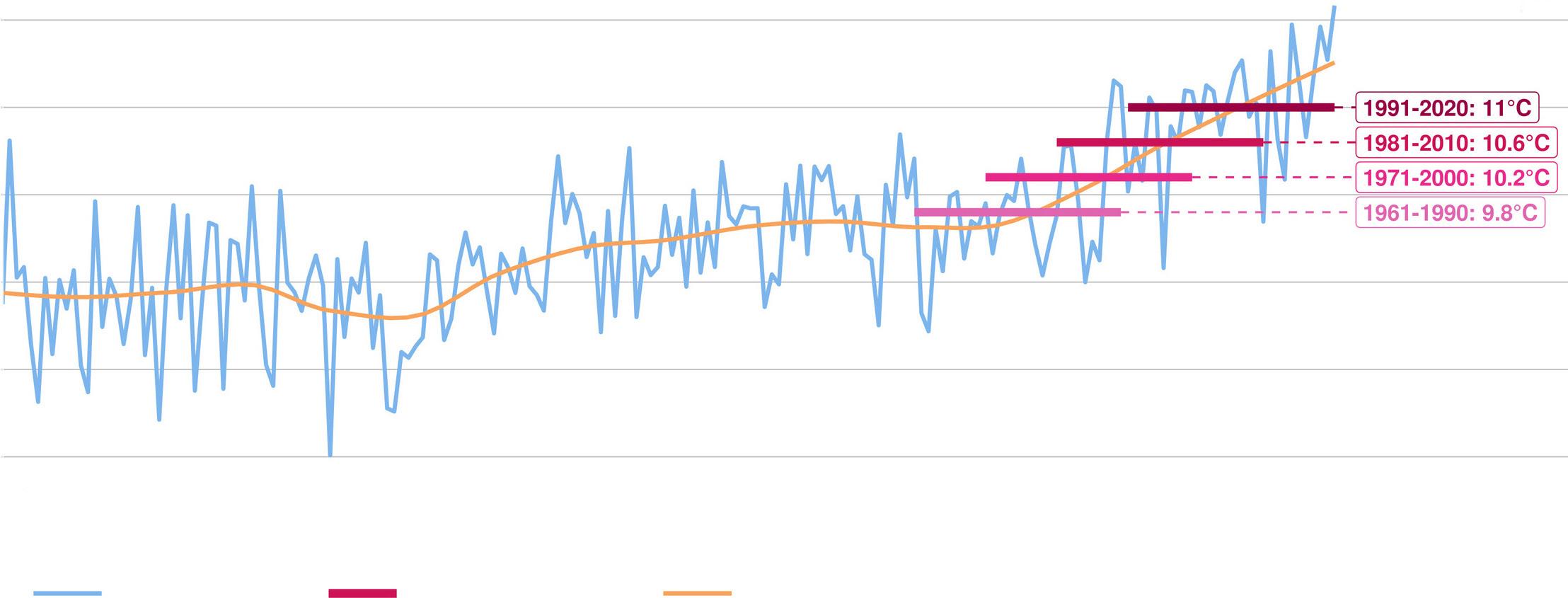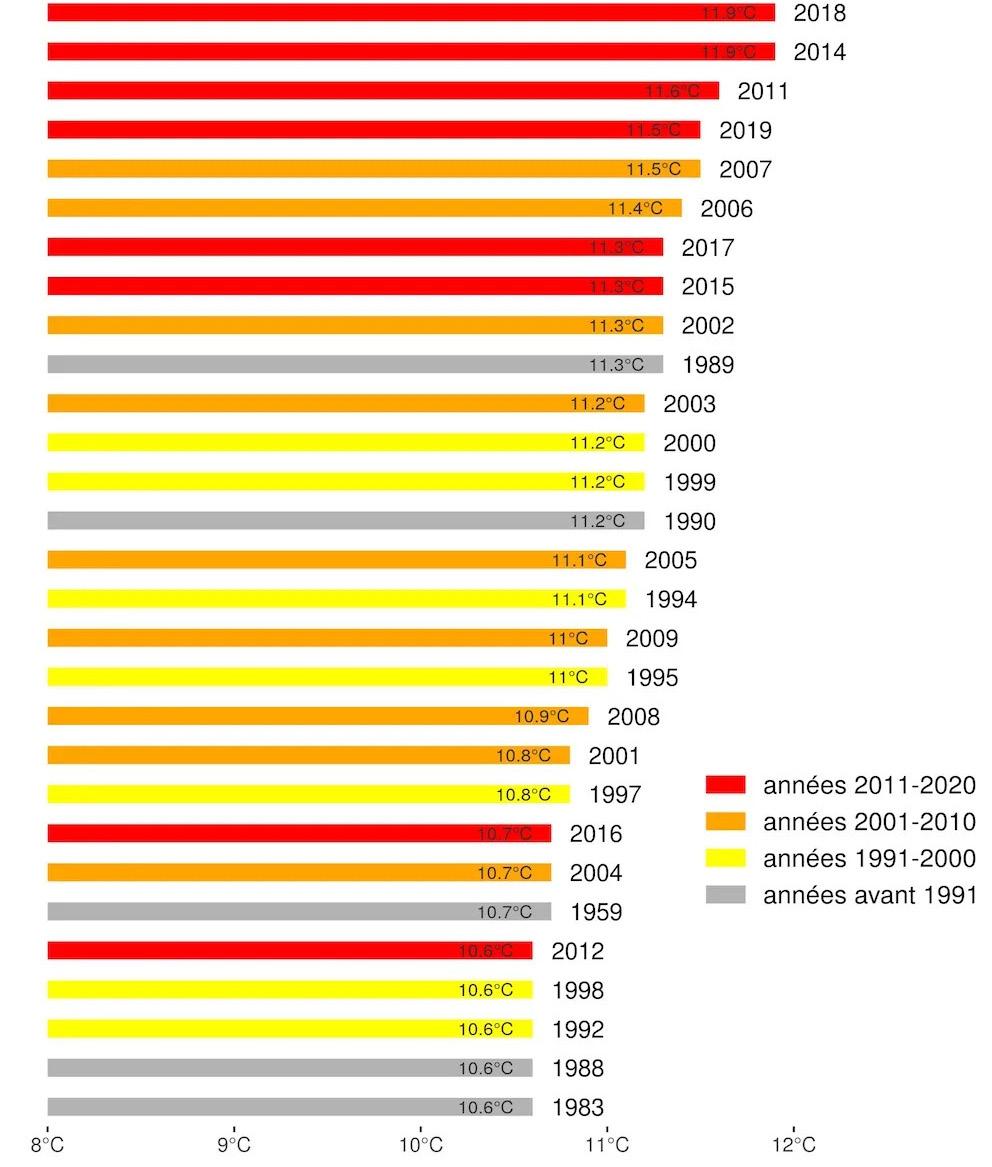 Plus inquiétant encore, si l’on regarde les températures moyennes les plus chaudes sur une longue période, les 20 années les plus chaudes sont postérieures à 1988, tandis que les 20 années les plus froides ont toutes été enregistrées avant 1896.
