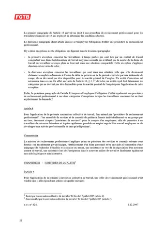 Enfin, le quatrième paragraphe de l'article 13 impose à l'employeur l'obligation d’offrir également une procédure de reclassement professionnel à ces deux catégories d'exceptions lorsque les travailleurs concernés lui en font explicitement la demande.]3 Article 4 Pour l'application de la présente convention collective de travail, l'on entend par "procédure de reclassement professionnel" : "un ensemble de services et de conseils de guidance fournis individuellement ou en groupe par un tiers, dénommé ci-après "prestataire de services", pour le compte d'un employeur, afin de permettre à un travailleur de retrouver lui-même et le plus rapidement possible un emploi auprès d'un nouvel employeur ou de développer une activité professionnelle en tant qu'indépendant". Commentaire La mission de reclassement professionnel implique qu'un ou plusieurs des services et conseils suivants sont fournis : un encadrement psychologique, l'établissement d'un bilan personnel et/ou une aide à l'élaboration d'une campagne de recherche d'emplois et à sa mise en œuvre, une assistance en vue de la négociation d'un nouveau contrat de travail, une assistance lors de l'intégration dans le nouveau milieu de travail et finalement également une aide logistique et administrative. CHAPITRE III - [CRITERES DE QUALITE]4 [Article 5 Pour l'application de la présente convention collective de travail, une offre de reclassement professionnel n'est valable que si elle répond aux critères de qualité suivants :