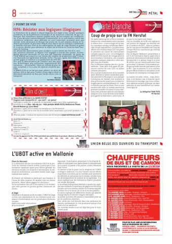 ne pas la voir partir aux States. Oui, les résultats de la FN ont explosé et ont permis de dégager un résultat net de 30 millions d’euros… mais ne perdons pas de vue que ces résultats sont ceux du Groupe FN et ne concernent pas Herstal uniquement. Oui, la Région Wallonne, propriétaire à 100 % de l’entreprise depuis 1998, nous a permis de sérieusement redresser la barre (puisqu’elle n’a jamais exigé à ce jour de return sur ses investissements) mais qu’en sera-t-il demain? Si la situation politique actuelle bascule quel avenir pour la FN ? Que se passera-t-il si les anciens projets MR de revente d’une partie ou de la totalité de l’entreprise ressurgissent? La mariée est belle, certes… mais attention, n’en faisons pas n’importe quoi! Retrouvez les messages que nous souhaitons adresser au banc politique, au banc patronal et aux travailleurs sur www. mwb-fgtb.be