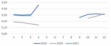 El incremento de los costes fue continuo a lo largo del año 2021, especialmente desde el mes de marzo y este sería decisivo para la campaña de hortalizas así como para las frutas. El sector del brócoli de Murcia apuntaba a un crecimiento del 25%, a lo que se sumó la paralización de las inversiones previstas ante la incerti dumbre provocada por nuevas subidas. La escalada de costes afectaría a todos y cada uno de los procesos productivos de las empresas hortofrutícolas, desde los insumos para el cultivo, como los fertili zantes, la energía, el agua, los plásticos y derivados para los envases, los materiales usados para la construcción y renovación de invernaderos, el transporte…