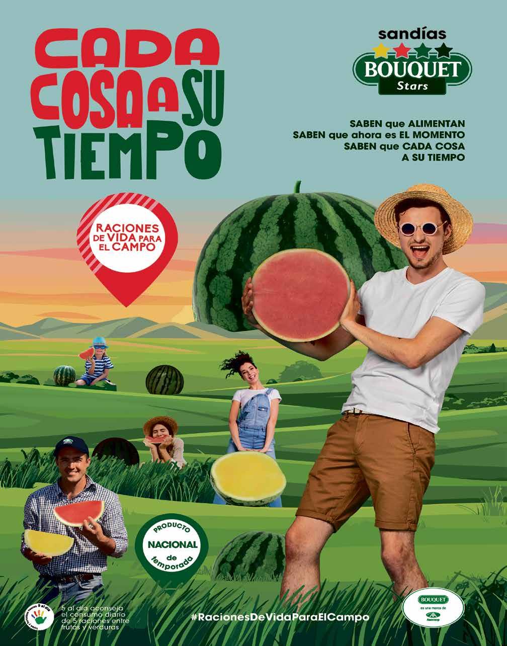 Twitch al resto de redes en las que se apoya la campaña. La publicidad exterior, es otro eje en el que basa la estrategia de la campaña. La publicidad aérea en las costas mediterráneas vuelve a ser una de las acciones de marketing off-line estrella del verano, ya que se prevé aforo lleno en las playas. Esta acción tan unida a la climatología se apoyará con la presencia de la campaña en las principales estaciones de AVE del país, aprovechando los desplazamientos vacacionales y asociando las sandías Bouquet a la temporada de estival y al buen tiempo. Por último, y como viene siendo habitual, la cooperativa de segundo grado mantiene su apoyo al deporte contribuyendo con fruta en diferentes eventos deportivos, y especialmente al deporte inclusivo con el patrocinio de la Asociación AVAPACE de Valencia y de la Fundación de Rugby URA Clan de Almería, con un respaldo anual que se intensifica durante la campaña de sandía.