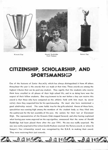 specul.ltion wu running high amon-3 the members of the student body as they filed into the auditorium for the last anembly of the ye.1r, the senion for their last at Claremont High. The reprcsenhtive of the Kiwanis Club stepped forward, and after having explaint:d what h,ning your name cngr.1ved on the cup signifies, announced that the name of Harold Duddri:lgc h.id been placed there after the year 1941. No one was really surprised.