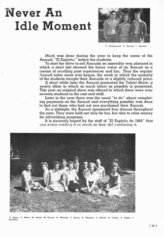 Much was done during the year to keep the name of -the Annual, "El Espiritu," before the students. To start the drive to sell Annuals an assembly was planned in which a short skit showed the future value of an Annual as a means of recalling past experiences and fun. Thus the regular l\.nnual sales week was begun, the week in which the majority of the students bought their Annuals at a slightly reduced price. A short while later the Annual presented the Talent Show, a yearly affair in which as much talent as possible is presented. This year an original show was offered in which there were over seventy students in the cast and staff. Later in the year there was the usual "to do" about complet ing payments on the Annual and everything possible was done to find out those who had not yea purchased their Annual. An a sidelight, the Annual sponsored four dances throughout the year. They were held not only for fun, but also to raise money for advertising purposes. It is sincerely hoped by the staff of "El Espiritu de 1945" that you en.joy rca.clbg it as much as they did producing it.