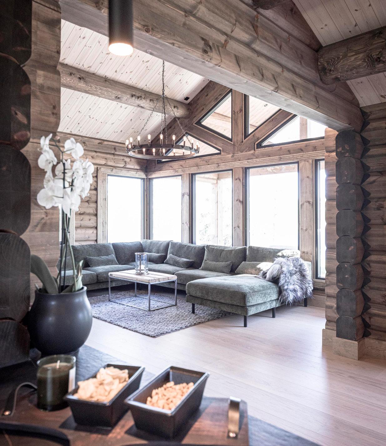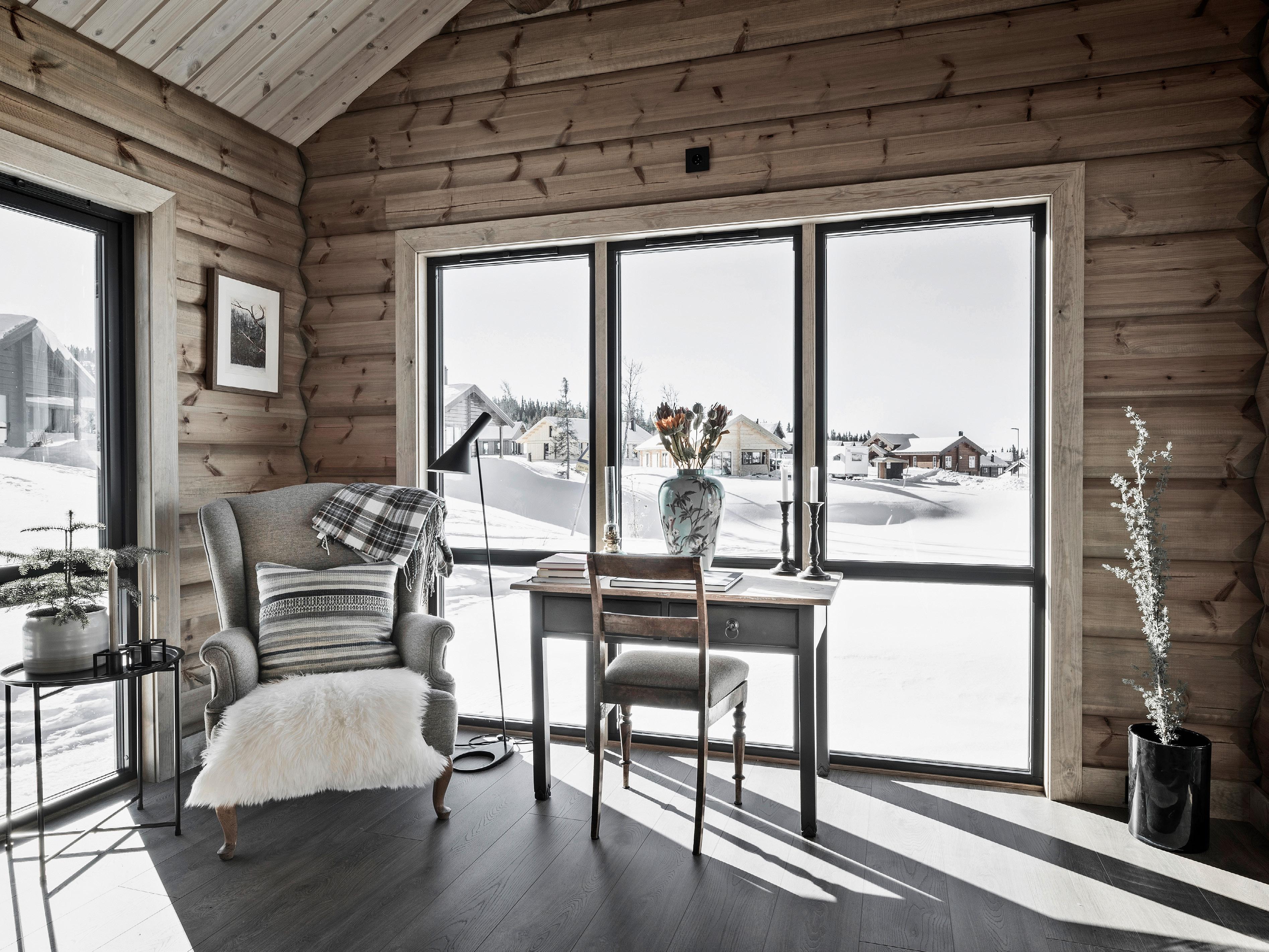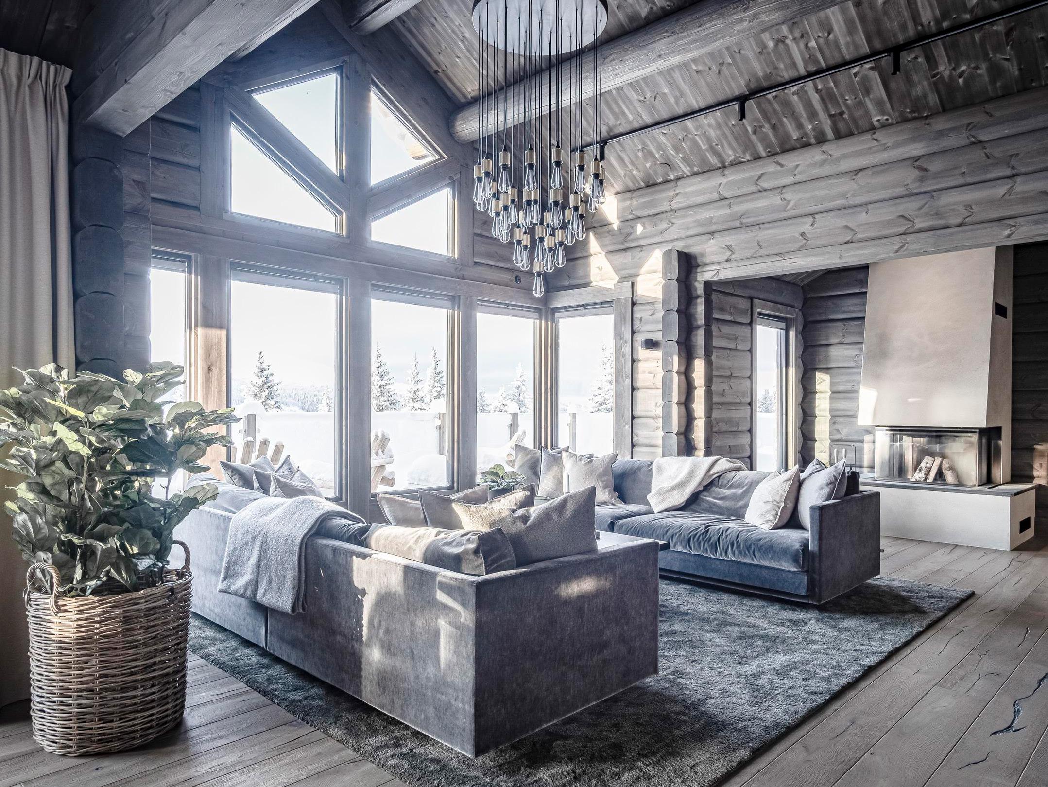 Med store flotte glassfasader inviterer hytten solen inn i stuen.