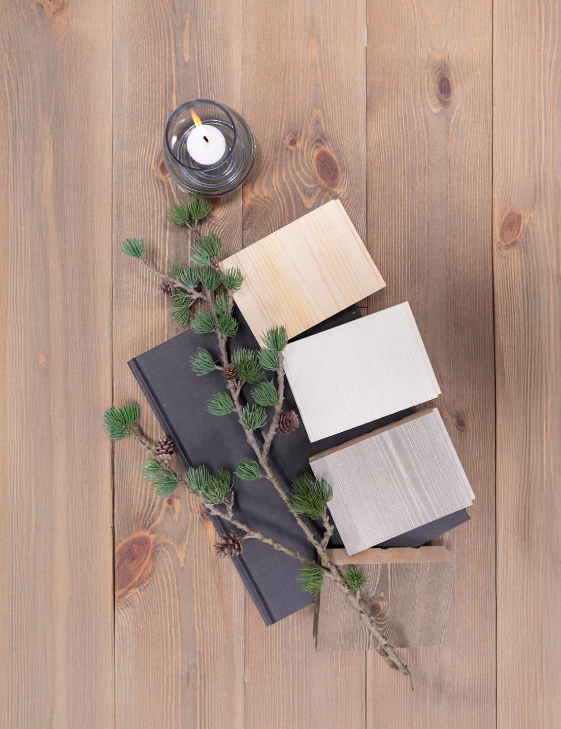 Som standard leveres ubehandlede overflater. Vi kan levere fabrikkbeiset veggpanel, gulv og listverk til alle rom i en av våre fargevalører mot et tillegg i pris. Veggpanel leveres av Bjertnæs Sag, mens heltre furugulv leveres av Norrlands trä. Vær oppmerksom på at fargene på bildene kan avvike fra virkelighet, vareprøver er tilgjengelig i våre visningshytter.