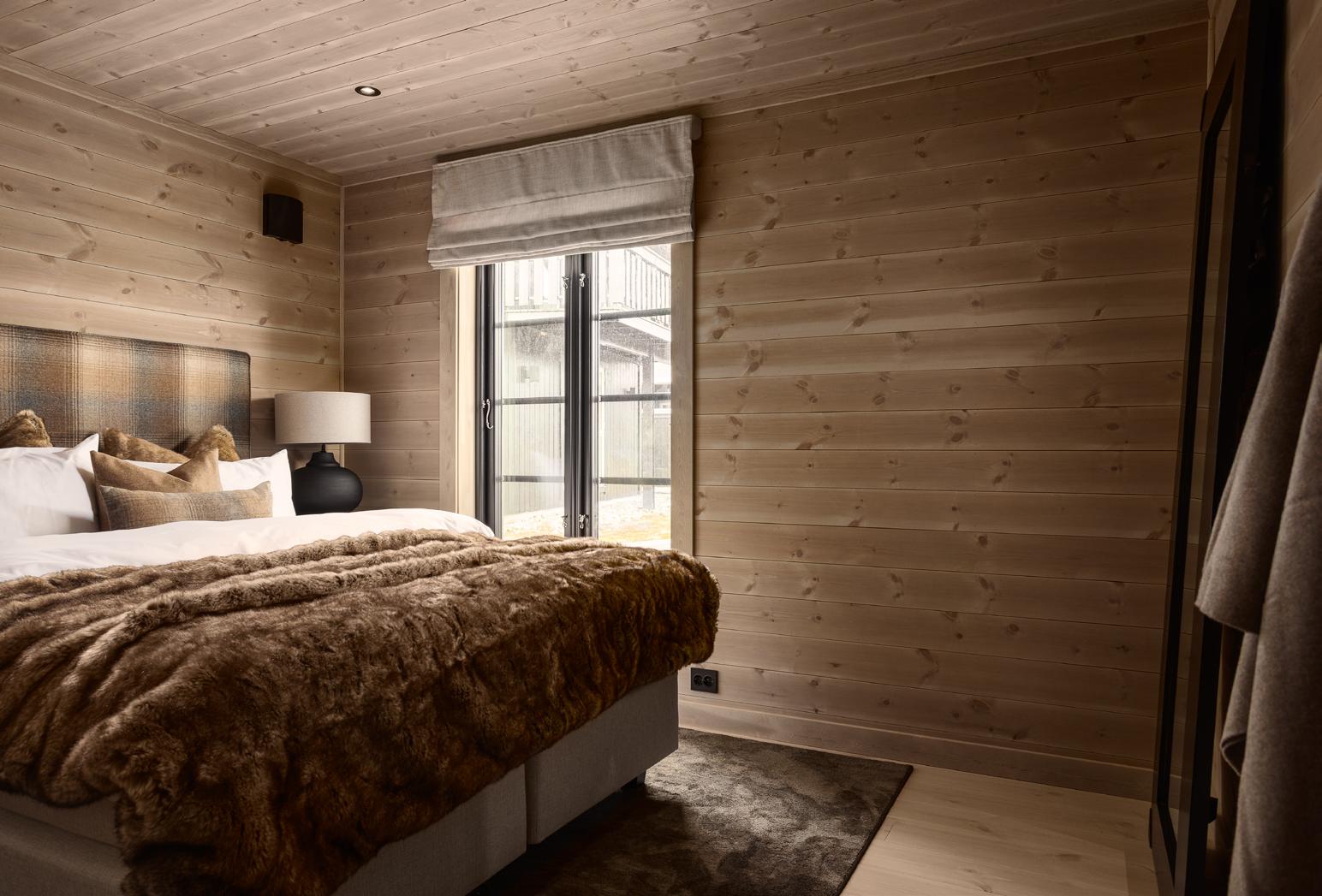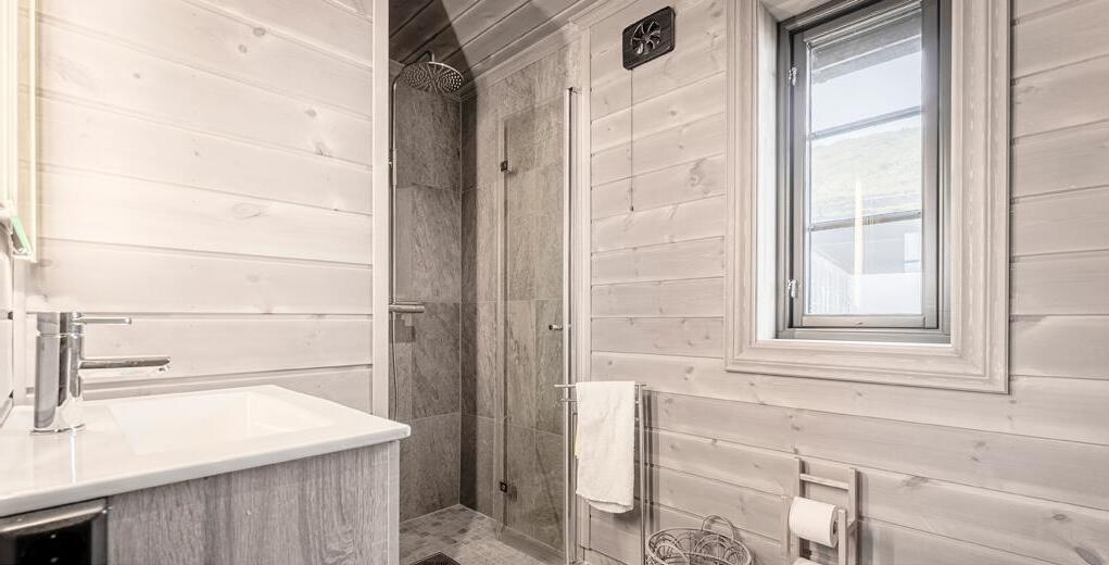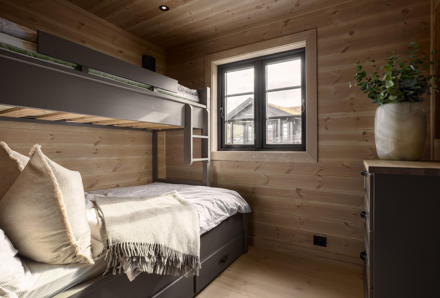 Overgangen mellom stue og kjøkken er sømløs, noe som forsterker den åpne og innbydende atmosfæren. Hytta inneholder fem romslige soverom, et flott bad, separat wc og en stor oppstue. En utvendig sportsbod gir praktisk oppbevaringsplass og sørger for orden i utstyret.